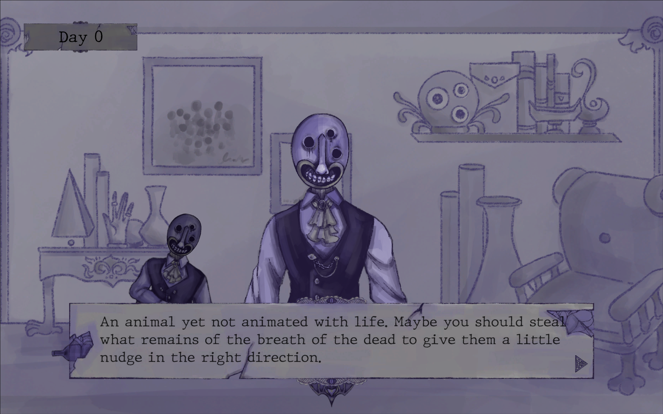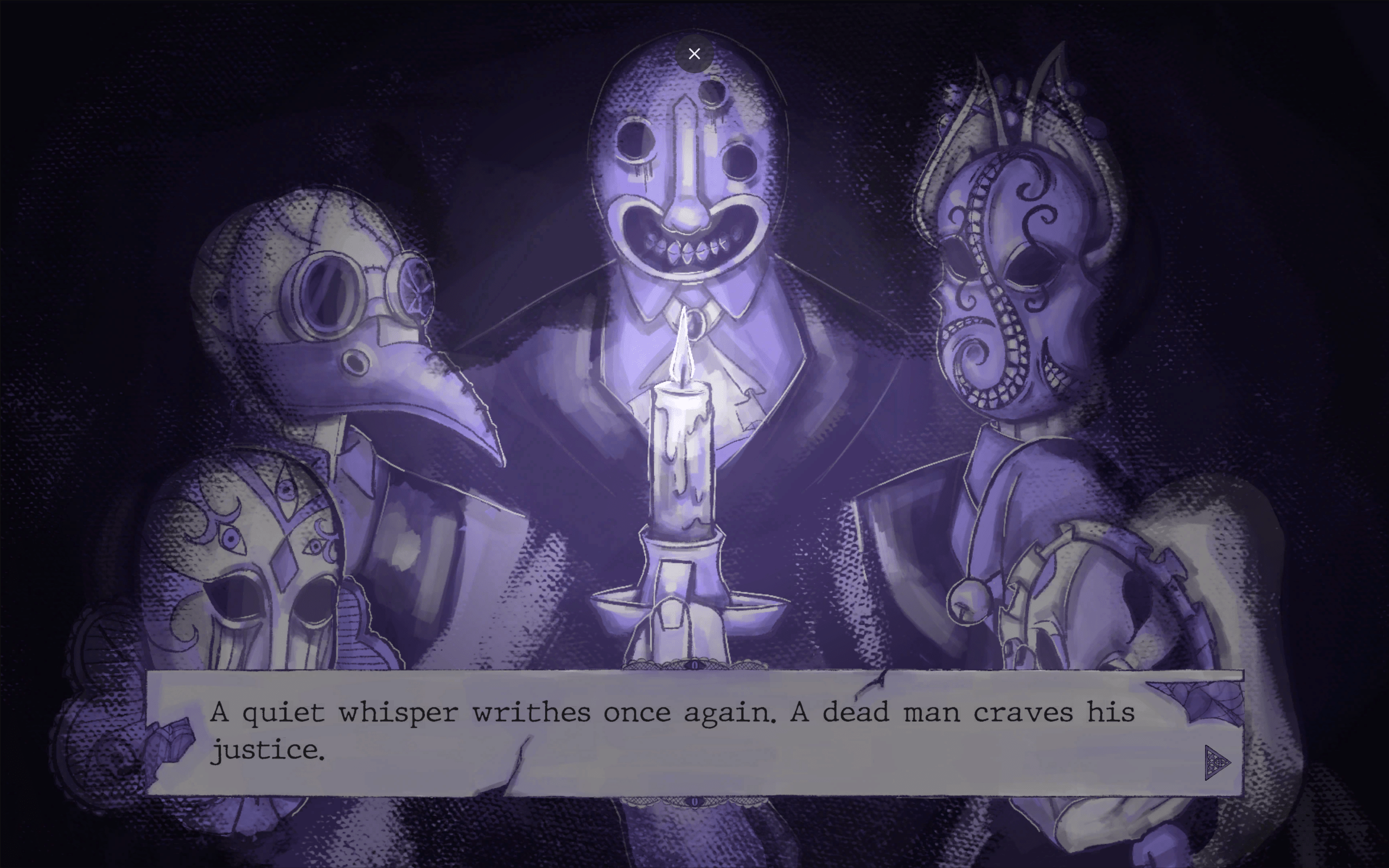 A Doctor, a Fiddler, an Aristocrat, a Drunk, and a Trickster are poised at the scene of the crime. A monster hidden behind ever-changing masks is responsible for the dead man sprawled at your feet. Pay attention to the chatter of the beasts as they gawk and gossip, to see who hides behind what facade, and uncover who the culprit is, and what face they wear now.